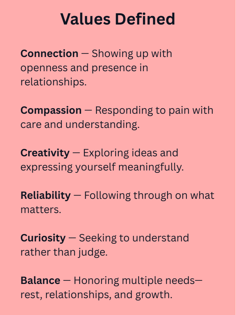 That’s why it’s so important to define your values in your own words. Without that clarity, it’s easy to get pulled into what you think a value “should” look like rather than staying true to what feels most authentic. When you understand what a value means to you, it becomes easier to notice when you’re living it, when you’ve drifted from it, and how you might lean into it more intentionally.
